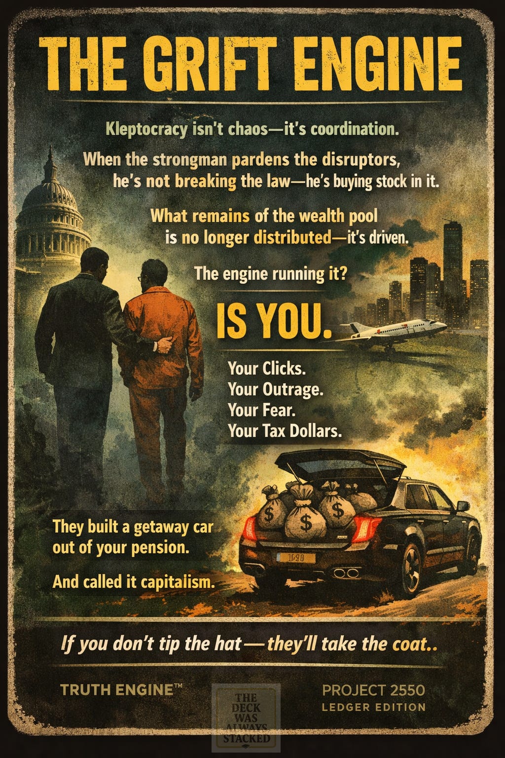 It hires a strongman, pardons the disruptors, and routes the remaining wealth upward — to a few — while the engine keeps running.