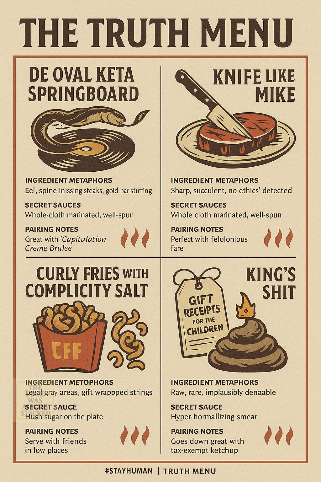 So here’s the menu — not satire, not metaphor, but inventory.