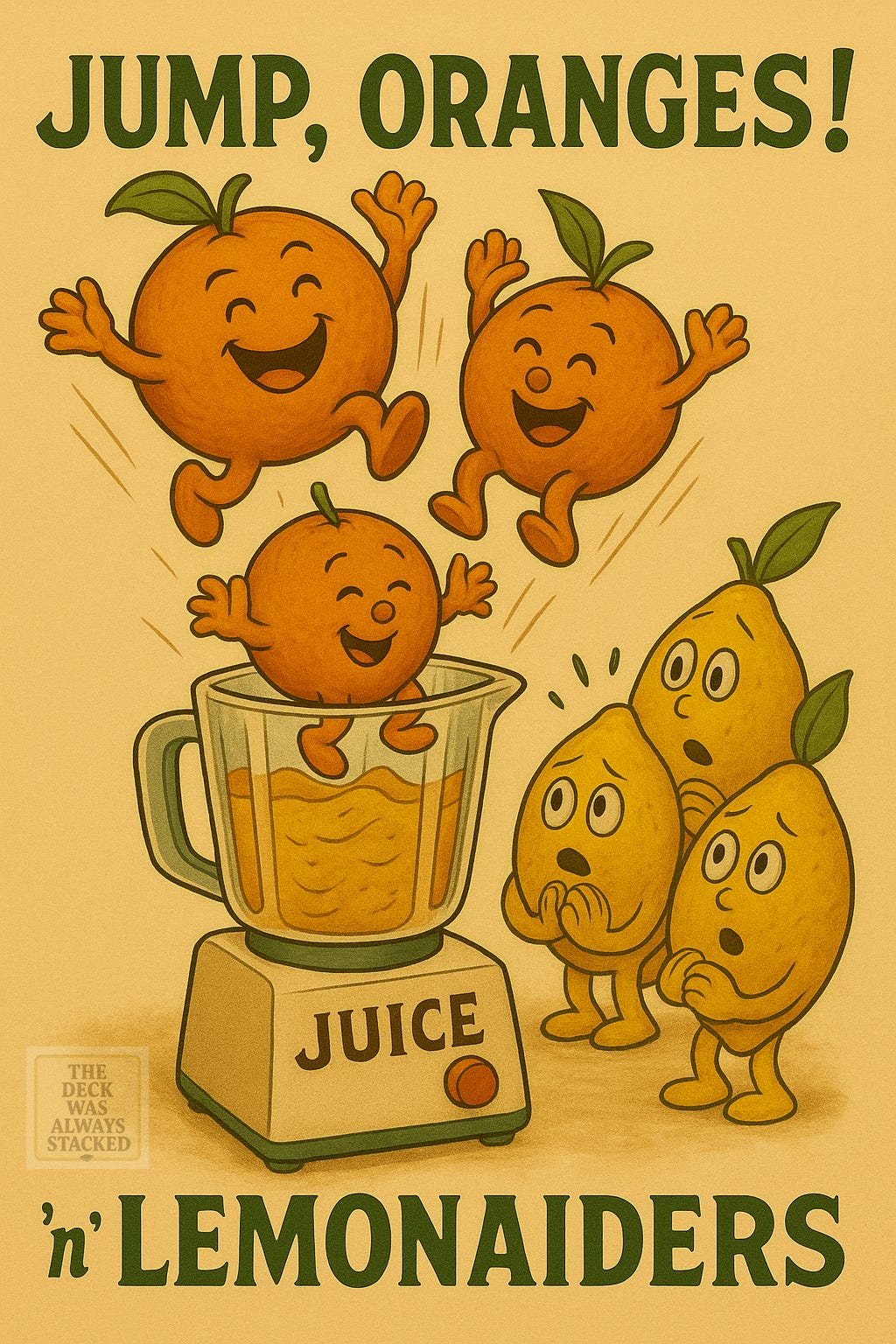 So here we are — oranges in the blender, lemons in shock, survivors rising, and the truth engine humming like a vault door sliding open. The juice is riding again, and the Lemonaiders are stepping into position.
