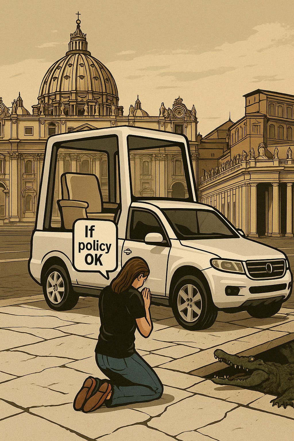 “The popemobile is empty when we need truth on the road. The Church you love becomes the seat of silence — while the mafia blesses the pipeline.”