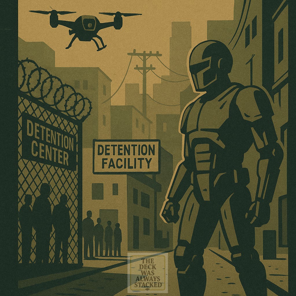 Automated wardens hover above a border made of mirrors — machines policing reflections of obedience long after the humans have gone. When safety becomes surveillance, the system runs itself — and calls it peace.