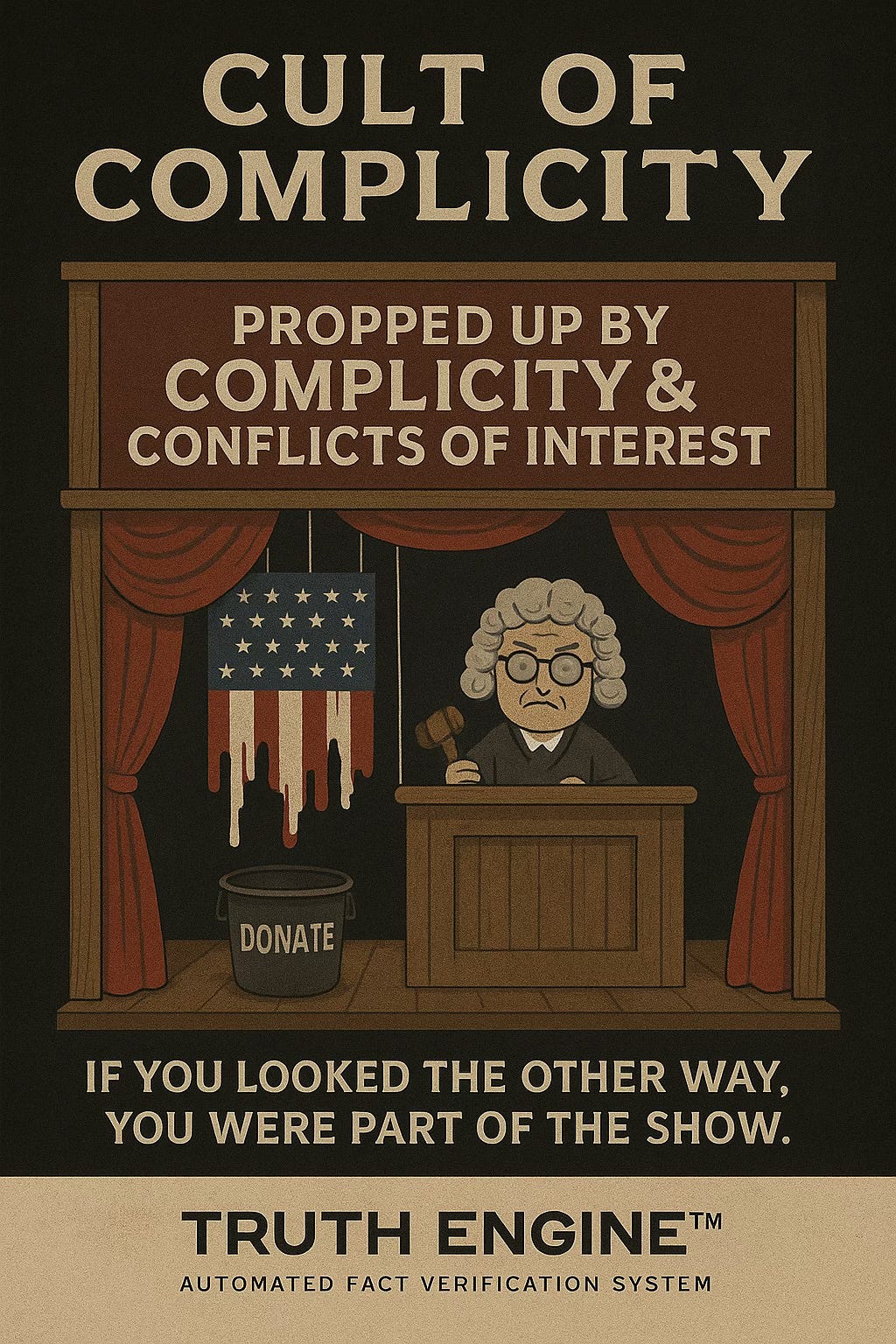 Alt Text: A courtroom turned theater: “Cult of Complicity.” Judges, officials, and systems propped up by conflicts of interest. Message: silence is participation.