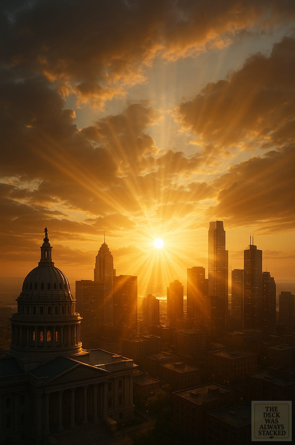 (AI Image Prompt: A hopeful sunrise over a city skyline, with rays of light illuminating both government buildings and financial districts – symbolizing knowledge and accountability breaking through the darkness of uncertainty.)