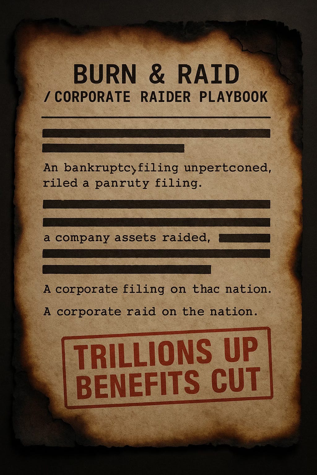 But in the first hundred days, trillions vanished upward, safety nets were torched, and benefits cut at the root. This isn’t budgeting — it’s a corporate raid on the nation. The same playbook Wall Street used to gut companies is now being run on the country itself: strip assets, dump debt, cash out offshore. The numbers don’t lie. The Guild doesn’t care. And the people left holding ash? Us.
